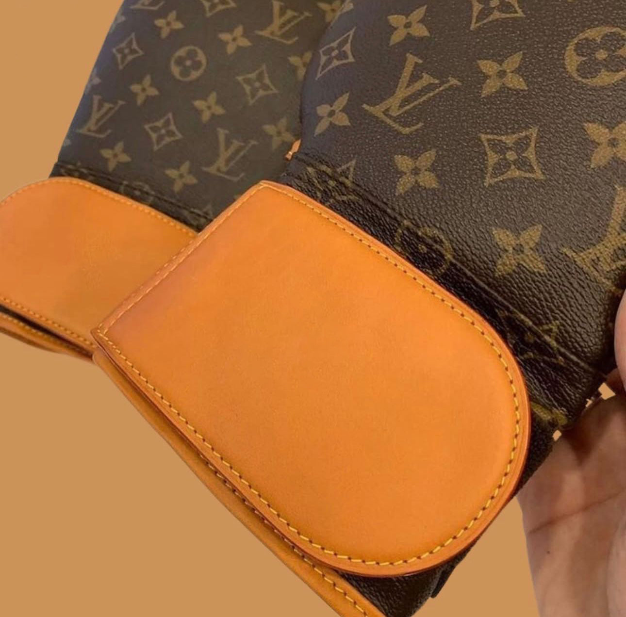 Crafted in Louis Vuitton’s signature brown and orange leather, these gloves feature the iconic LV monogram. The accompanying dust bag is marked with “K.L.,” a subtle nod to the collaboration between Karl Lagerfeld and Louis Vuitton.